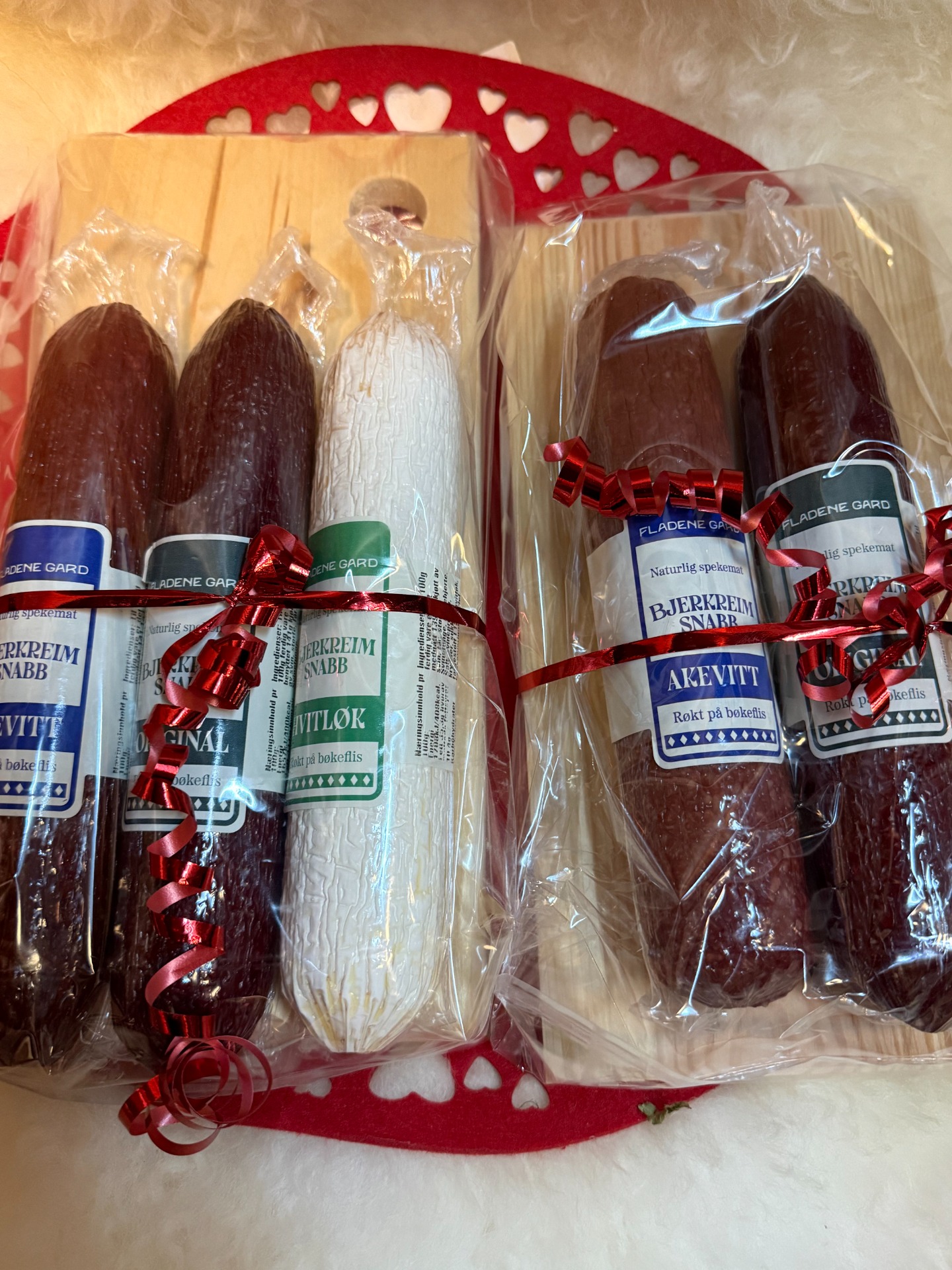 Gavepakkning med 3 Bjerkreimsnabb pakket på skjære fjøl, pakket i cellofan.